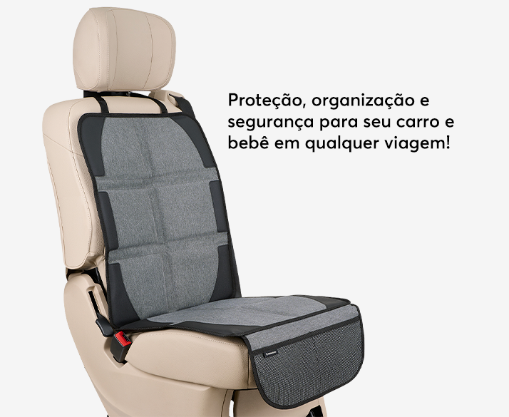 Proteja o estofamento do carro contra manchas e arranhões com o Car Seat Protector. Material antiderrapante, fixação compatível com Isofix e 2 bolsos de malha para brinquedos e lanches. Fácil de instalar, combina durabilidade, segurança e organização no uso da cadeirinha.