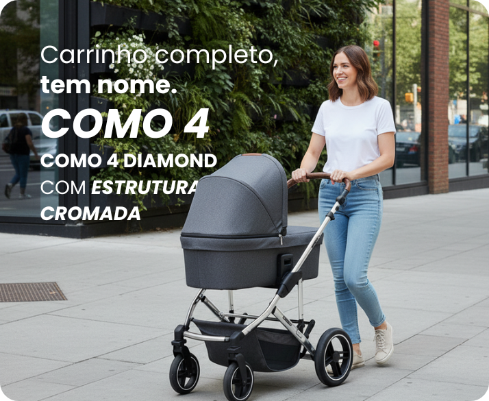 O Como 4 Diamond possui estrutura 100% alumínio com pintura cromada e amortecedores nas rodas traseiras, que proporcionam um passeio mais estável e confortável para o bebê. Além disso, conta com um cesto de objetos espaçoso que suporta até 5 kg.