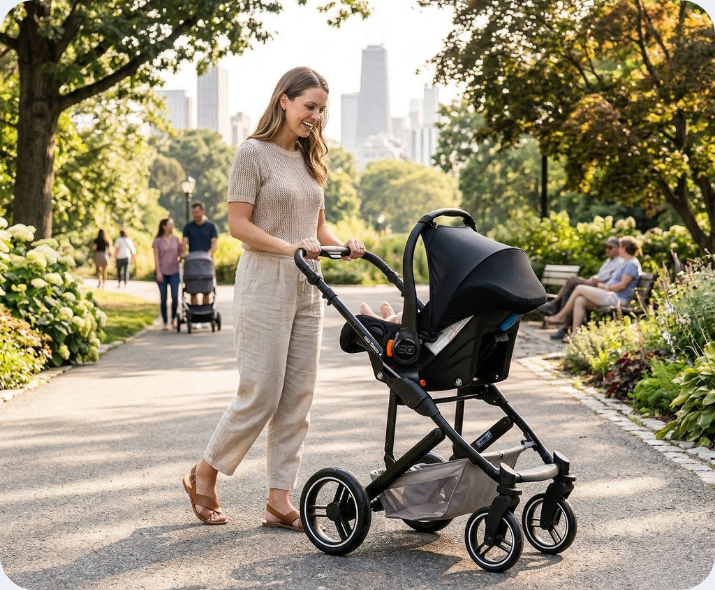 Diferente de carrinhos fixos, a manopla do Como 4 é ajustável em altura. Isso é um benefício direto para a saúde postural dos pais: não importa se quem está empurrando é mais alto ou mais baixo, o ajuste garante que ninguém precise se curvar, evitando dores nas costas após o passeio.