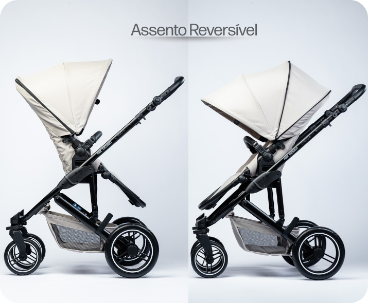 O assento principal pode ser colocado de frente para os pais e também de frente para o mundo. Poder olhar para o bebê o tempo todo traz uma segurança emocional enorme para os pais. Quando a criança fica mais curiosa, basta inverter a posição para ela explorar o ambiente. O assento principal pode ser utilizado a partir dos 6 meses até 22kg, antes dos 6 meses, precisa utilizar o moisés e o bebê conforto, já que acoplam diretamente na estrutura sem dificuldade.