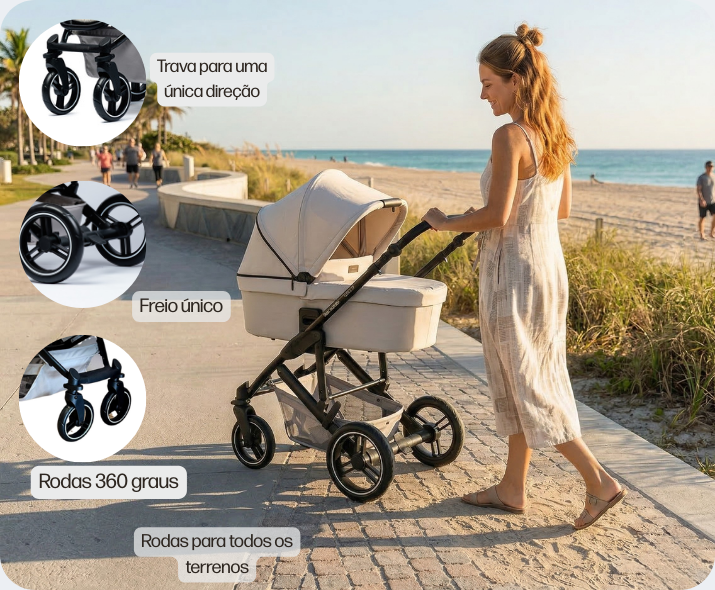 Graças às rodas com rolamento e amortecedores, o esforço para empurrar o carrinho é mínimo. Para os pais, isso se traduz em passeios menos cansativos, mesmo em terrenos levemente irregulares. As rodas dianteiras giratórias em 360° permitem fazer curvas fechadas em corredores de lojas ou elevadores com uma mão só. Além de acompanhar também a trava para uma única direção.