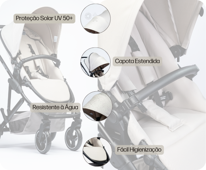 O bem-estar do bebê é a tranquilidade dos pais. O tecido do Como 4 possui proteção solar UV 50+ e tecnologia antiaquecimento. Isso garante que, mesmo em dias ensolarados, o interior do carrinho permaneça fresco e a pele sensível do bebê esteja protegida contra os raios solares. Imprevistos acontecem, seja uma chuva leve ou um suco derramado. O tecido é resistente à água, o que impede que líquidos penetrem imediatamente nas fibras. Isso facilita muito a vida dos pais na hora da limpeza rápida e preserva a aparência de "novo" do carrinho por muito mais tempo.