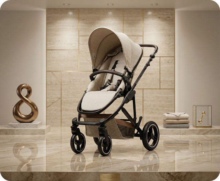 Fabricado com estrutura 100% em alumínio, o carrinho é extremamente durável. Para os pais, isso significa a confiança de ter um produto que não vai apresentar folgas ou problemas mecânicos rapidamente, mantendo um alto valor de revenda futuramente e entregando um visual sofisticado e moderno.