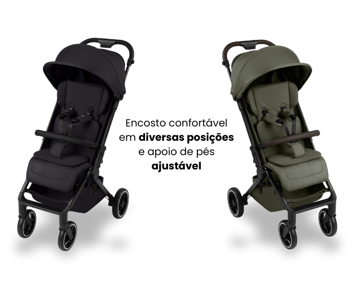 Encosto super acolchoado com várias posições, incluindo modo deitar totalmente plano, além de apoio para os pés ajustável em duas alturas. Assim, o bebê tem o máximo de conforto em qualquer situação, seja para tirar uma soneca ou acompanhar tudo ao redor durante o passeio.
