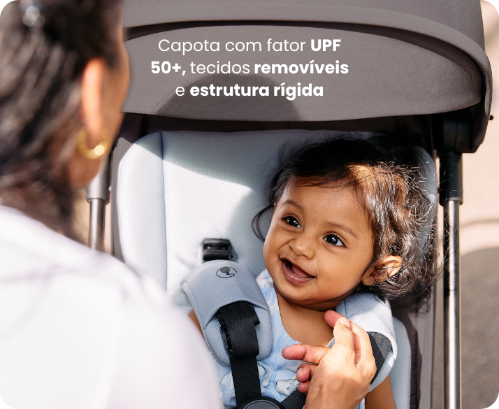 A capota grande protege contra sol intenso com tecnologia UPF 50+, enquanto a área de ventilação garante circulação de ar eficiente. Estrutura rígida em alumínio e tecidos removíveis e laváveis oferecem durabilidade e facilidade de limpeza no dia a dia.