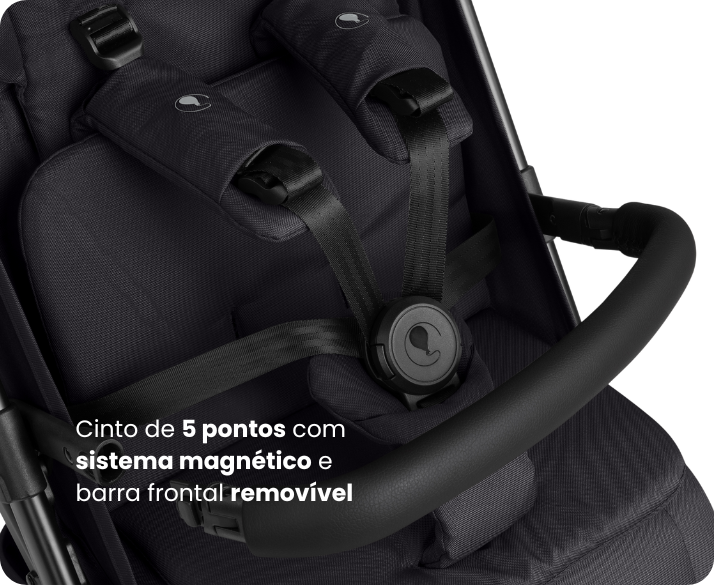 Exclusivo sistema de cinto de 5 pontos com fechamento magnético e barra frontal destacável tornam o uso seguro e prático. Indicado para crianças que já sentam sozinhas.