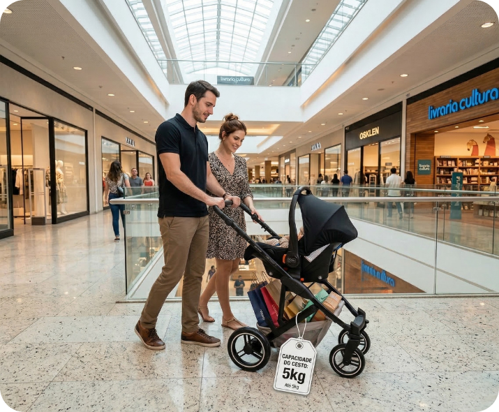 Levar bolsa de maternidade, compras e brinquedos pode ser um desafio. O cesto inferior do Como 4 Tradicional é espaçoso e suporta até 5 kg. Isso libera as mãos e os ombros dos pais, permitindo que o foco principal seja apenas o bebê e o caminho à frente.
