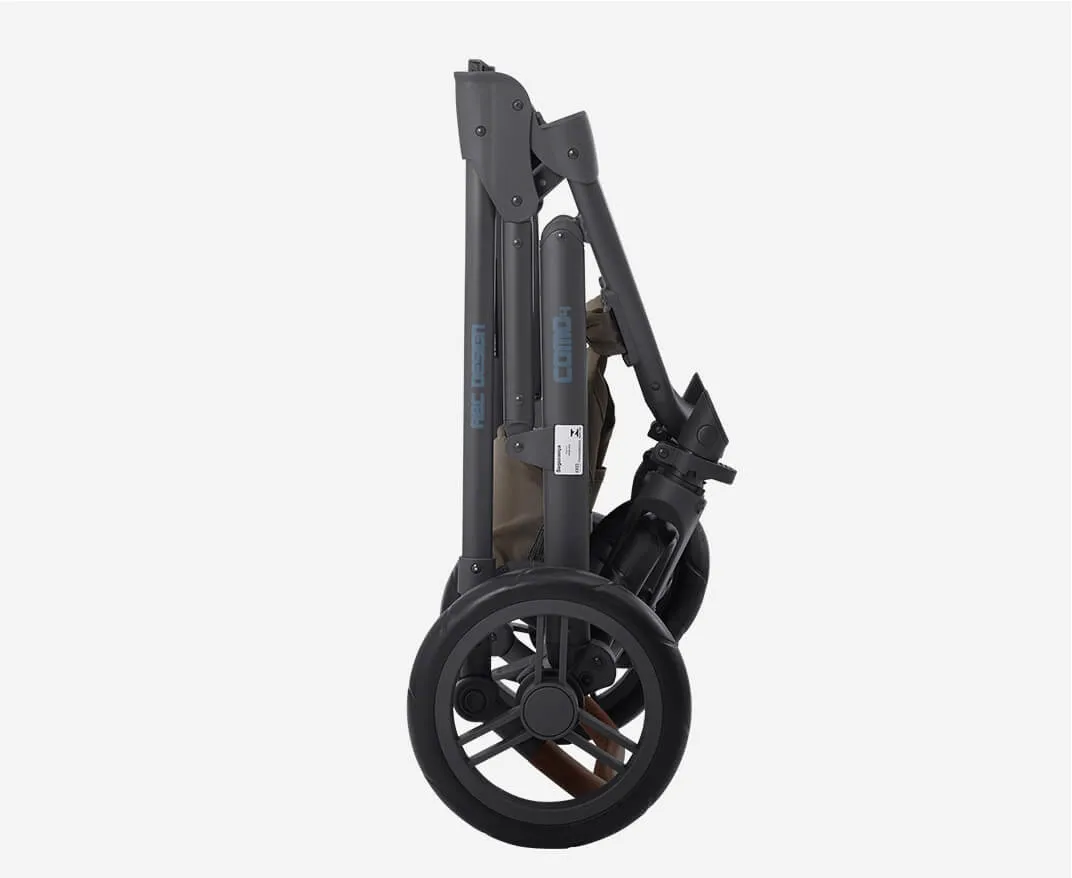 Com uma estrutura dobrável, o modelo Como 4 possui um fechamento prático podendo ser fechado com ou sem o assento principal, tendo a possibilidade de remoção das rodas, tornando-o mais compacto.
