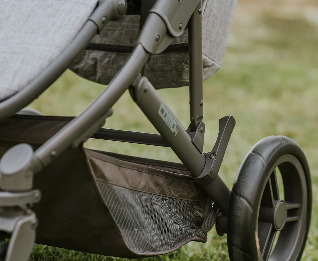 O Como 4 possui estrutura 100% alumínio e amortecedores nas rodas traseiras, que proporcionam um passeio mais estável e confortável para o bebê. Além disso, conta com um cesto de objetos espaçoso que suporta até 5 kg.
