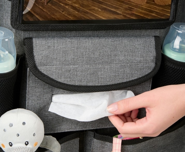 O compartimento integrado para lenço umedecido foi pensado para tornar cada passeio mais prático e sem imprevistos. Com acesso fácil e rápido, permite retirar os lenços com apenas uma mão, ideal para momentos de limpeza, alimentação ou pequenas emergências durante o trajeto. Posicionado de forma estratégica na bolsa organizadora, mantém o lenço sempre protegido, limpo e pronto para uso, sem a necessidade de abrir bolsas ou procurar no carro. Mais higiene, agilidade e tranquilidade em qualquer viagem.