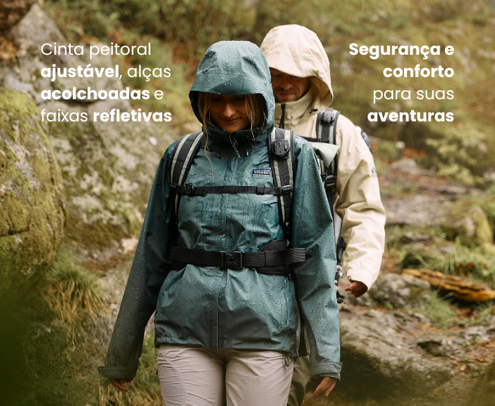 Alças acolchoadas com ventilação, cinta peitoral ajustável com apito SOS, cinto de quadril removível, D-rings nas alças para acessórios e faixa refletiva frontal garantem conforto e alta segurança, seja para trilhas urbanas ou aventuras noturnas.