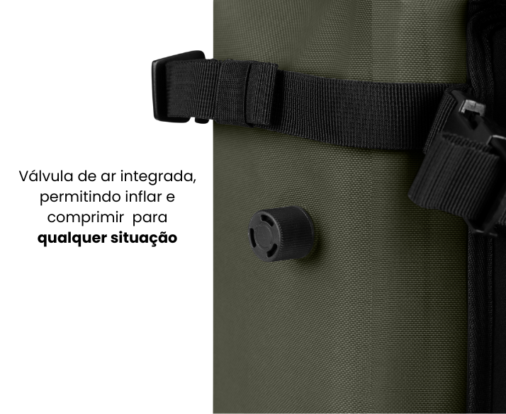 Válvula de ar integrada para ajuste do volume, compactação ou flutuação, além de compatibilidade com carrinho e reboque de bicicleta via suporte universal, proporcionando versatilidade máxima no uso diário.