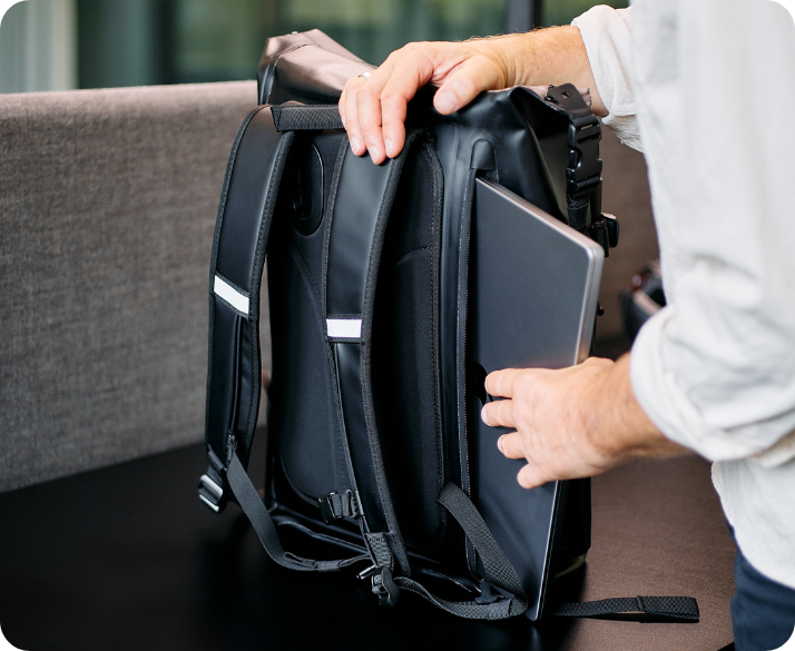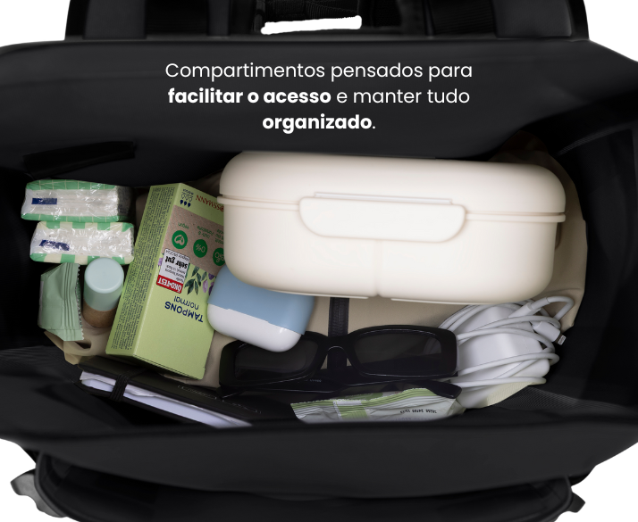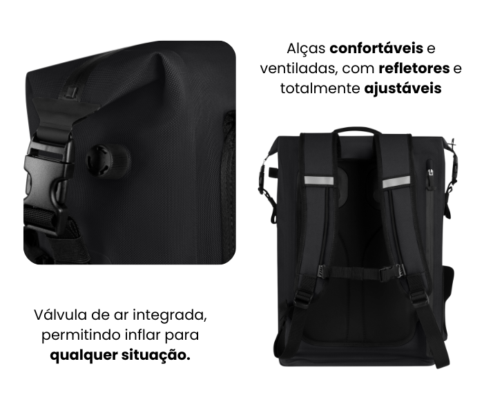 Bolso flexível externo ajustável por alças, parte inferior com aberturas para drenagem. Compartimento escondido para laptop até 16”, com forro macio e zíper impermeável. Porta-garrafa externo ajustável via velcro.