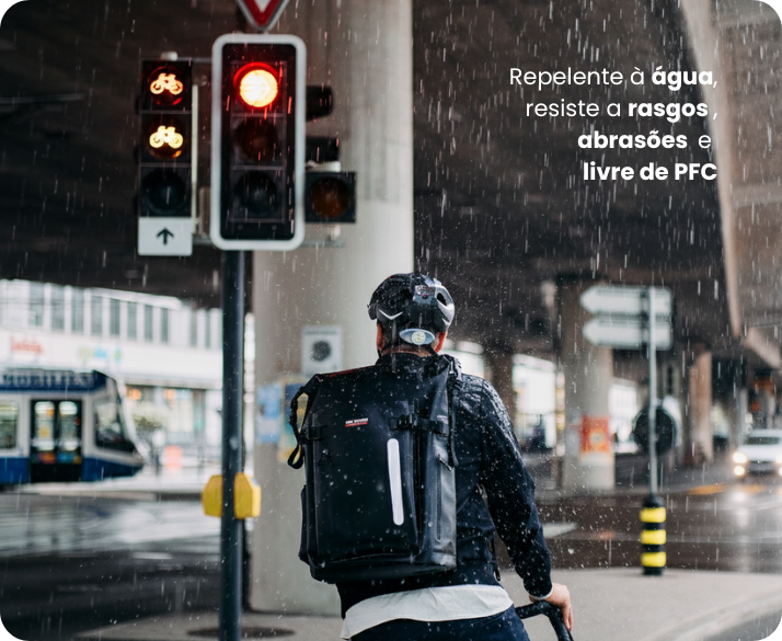 Compartimento principal espaçoso com zíper impermeável e ampla abertura. Aba de segurança com ilhó permite uso de cadeado. Dois bolsos frontais externos com zíper à prova d’água para itens de uso frequente.